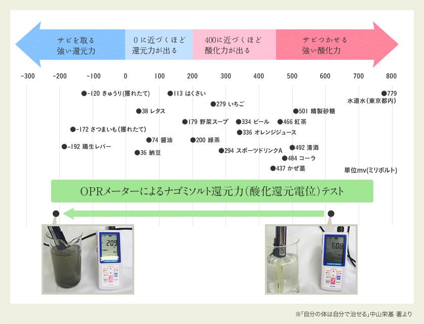 通常、時間が経てば酸化されて還元力が落ちるのですが、ナゴミソルトは還元力を保ちます。